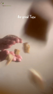 Prepare the tofu: cut into square-sized pieces and air-fry at 400°F (200°C) for about 20 minutes until crispy on the outside but still slightly soft inside.