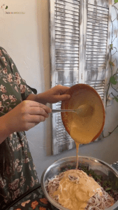 Make the dressing: combine peanut butter, lime juice, salt, chili garlic powder, and a little water. Keep it thick but pourable, like a salad dressing.