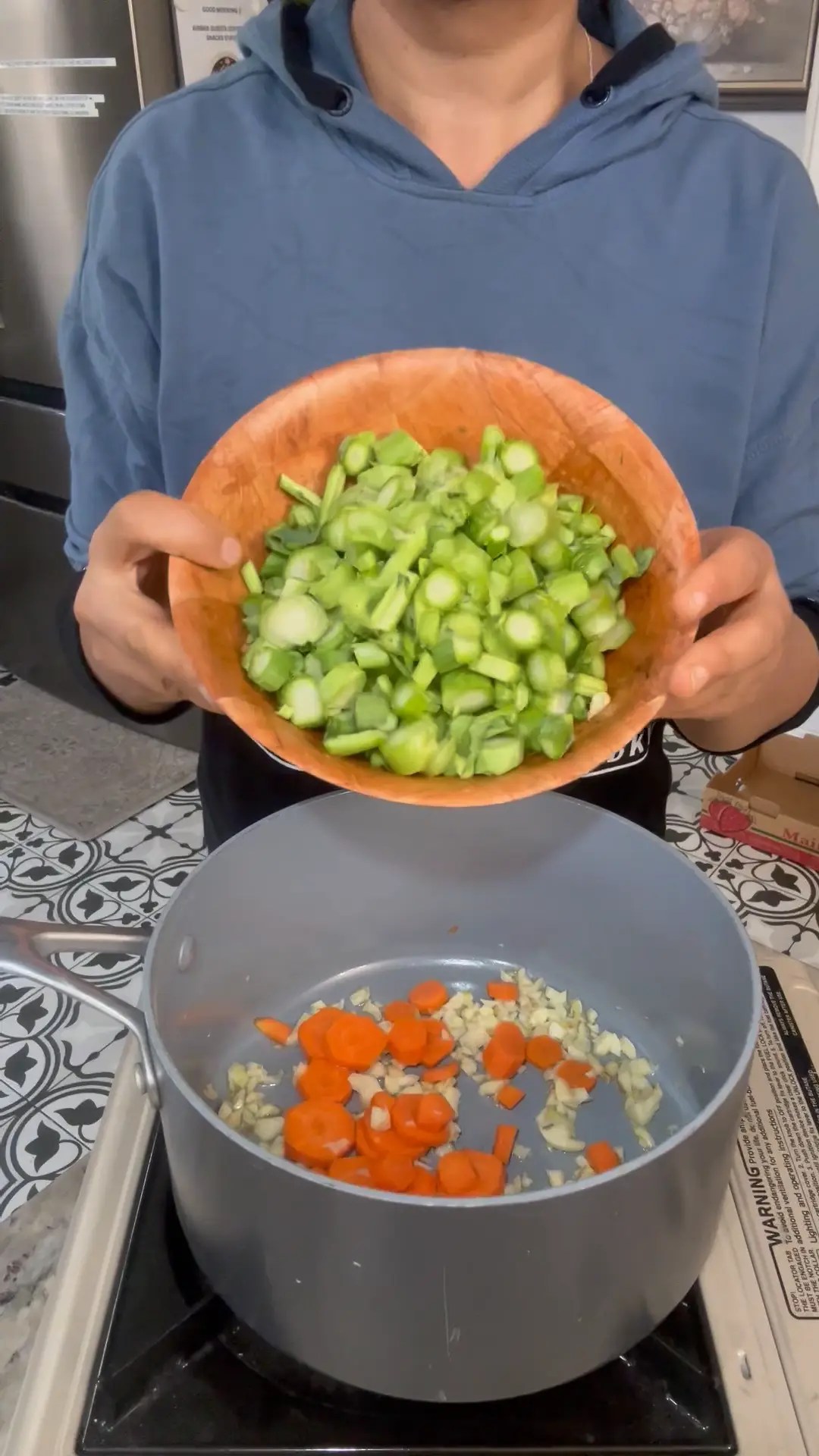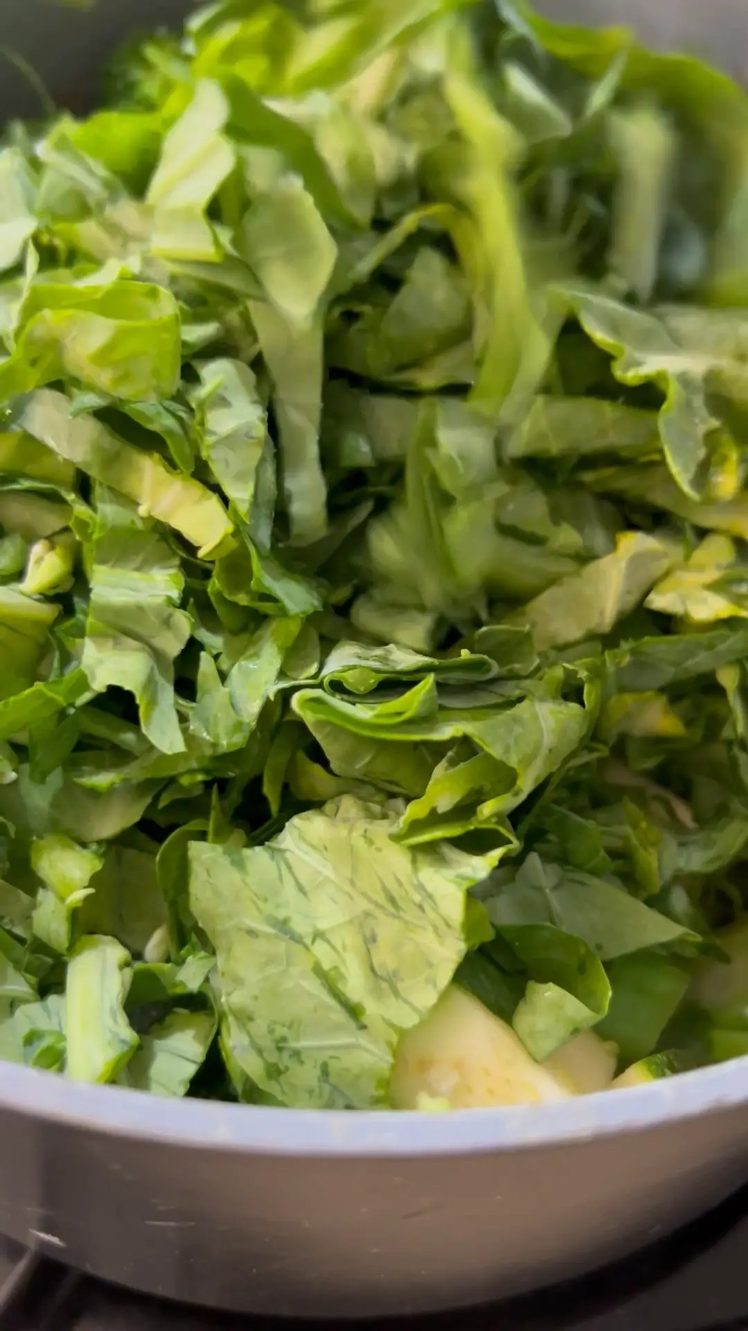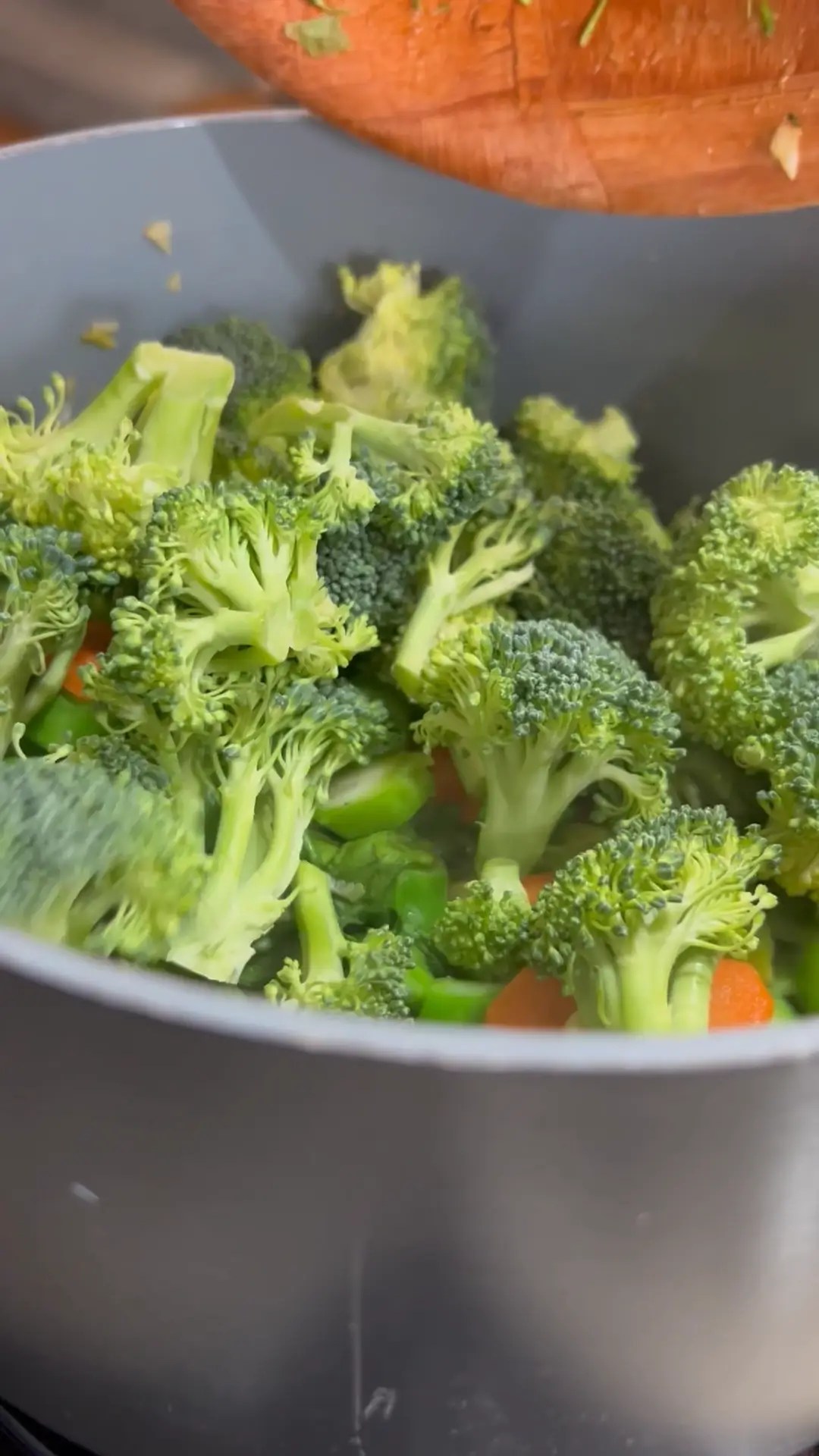 While the cowpeas are cooking, heat a pan (no oil needed). Sauté the garlic until fragrant. Add the carrots and cook for a minute. Then add Chinese broccoli stalks, broccoli florets, zucchini, and leafy greens. Sauté gently, keeping the vegetables slightly crispy.