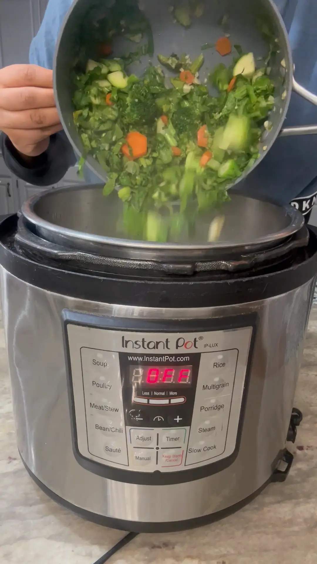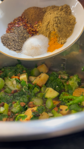 Once the cowpeas are cooked, add the sautéed vegetables, air-fried tofu (air fried at 400 degree F for 22 mins - flipping halfway through), and all the spices (coriander, turmeric, black pepper, chili garlic powder, cumin, and salt) to the Instant Pot. Stir well and simmer for 5 minutes to allow flavors to meld.
