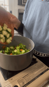While cooking if the veggies start sticking to the saucer , add a little water to help them cook. Repeat this step whenever veggies sticking to the cookware.Â