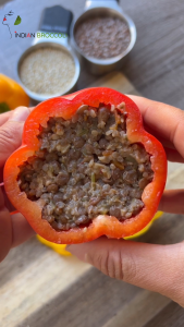 Bell peppers stuffed with a hearty mix of brown lentils, quinoa, walnuts, and vegetables, baked until tender and served with creamy green high-protein sauce. A wholesome, protein-rich, oil-free vegan meal.