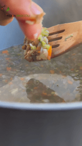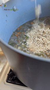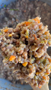 Once the lentils are cooked, add the soaked quinoa and just enough water to cover it. Cook until the quinoa is fully done and all the water is absorbed. The mixture should be moist but not watery since it will be used as stuffing.