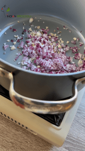 Place a deep pan or pot over medium heat. Add chopped garlic and sauté until fragrant. Add chopped onions and cook until translucent. If the mixture starts sticking (since it’s oil-free), add a few tablespoons of water.