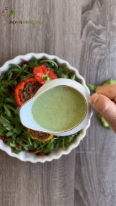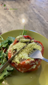 Bell peppers stuffed with a hearty mix of brown lentils, quinoa, walnuts, and vegetables, baked until tender and served with creamy green high-protein sauce. A wholesome, protein-rich, oil-free vegan meal.