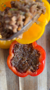 Fill each bell pepper generously with the lentil-quinoa mixture. Place the stuffed peppers in a baking dish and cover with the pepper tops.