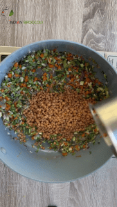 Once the lentils are cooked, add the soaked quinoa and just enough water to cover it. Cook until the quinoa is fully done and all the water is absorbed. The mixture should be moist but not watery since it will be used as stuffing.