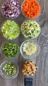 Wash and chop all the vegetables. Soak the quinoa and brown lentils separately for at least 1 hour, then drain and set aside.