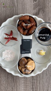 Collect all ingredients: dates, figs, tamarind pulp, ginger, chile de árbol, and salt.