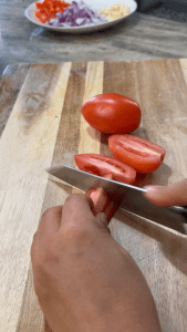Roughly chop the garlic, onions, red bell pepper, tomatoes, and spinach. No need to be precise since everything will be blended later.