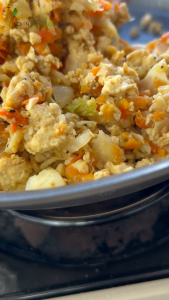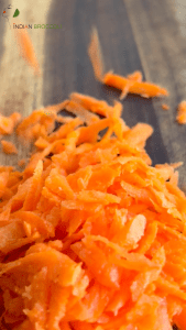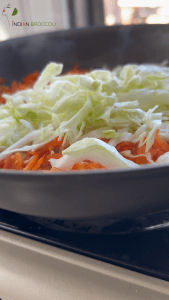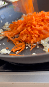 Add the grated carrots to the pan. If the mixture starts sticking (since this is zero-oil), add a splash of water. Cook until lightly softened but still slightly crunchy.